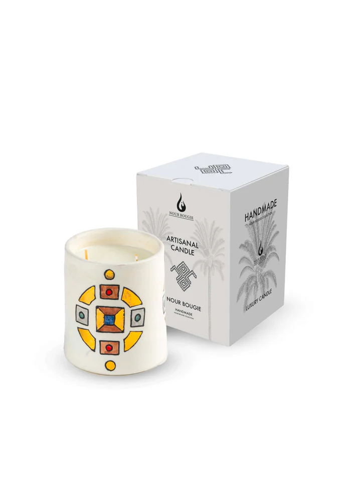 Bougie Cléopatra en céramique avec deux mèches en coton biodégradable. Caractéristiques : Senteur : Oud Matière : Céramique 100% Cire végétal Dimensions : Diamètre : 10 cm Hauteur : 12 cm 2 mèches en coton biodégradables