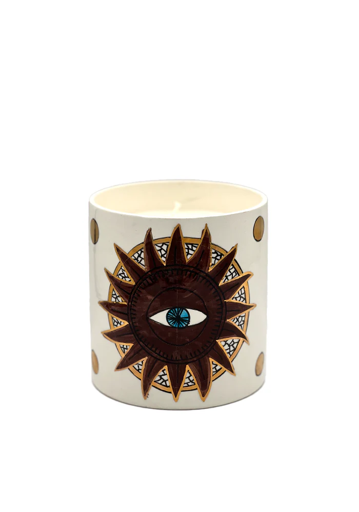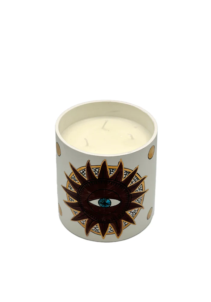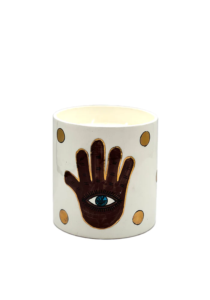 Bougie Khmisa moyen modèle en céramique avec des motifs yeux et des pois dorés. Caractéristiques : Parfum : Oriental Dimensions : D12 x H13 cm 4 mèches 100% coton Cire de soja