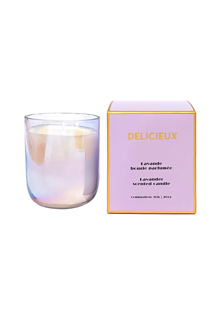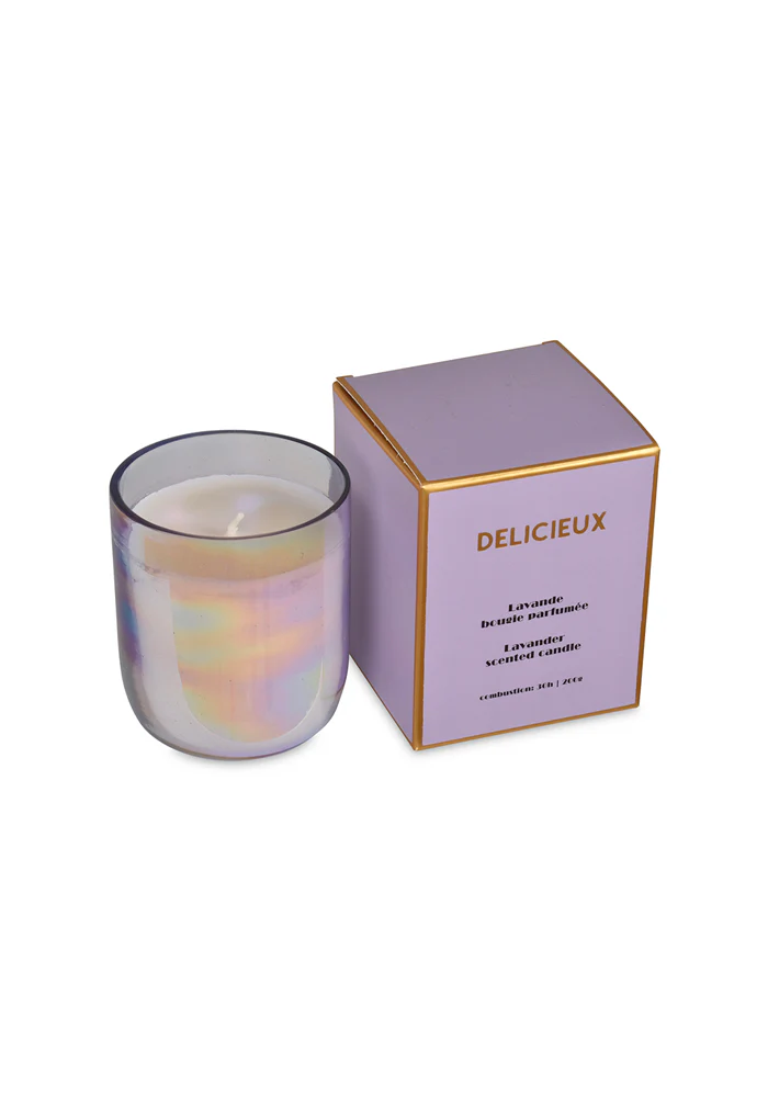 Bougie avec message Délicieux senteur lavande. Caractéristiques : Senteur : Lavande Combustion : 30h Quantité : 200g Dimensions : environ 9 x 7,3 cm
