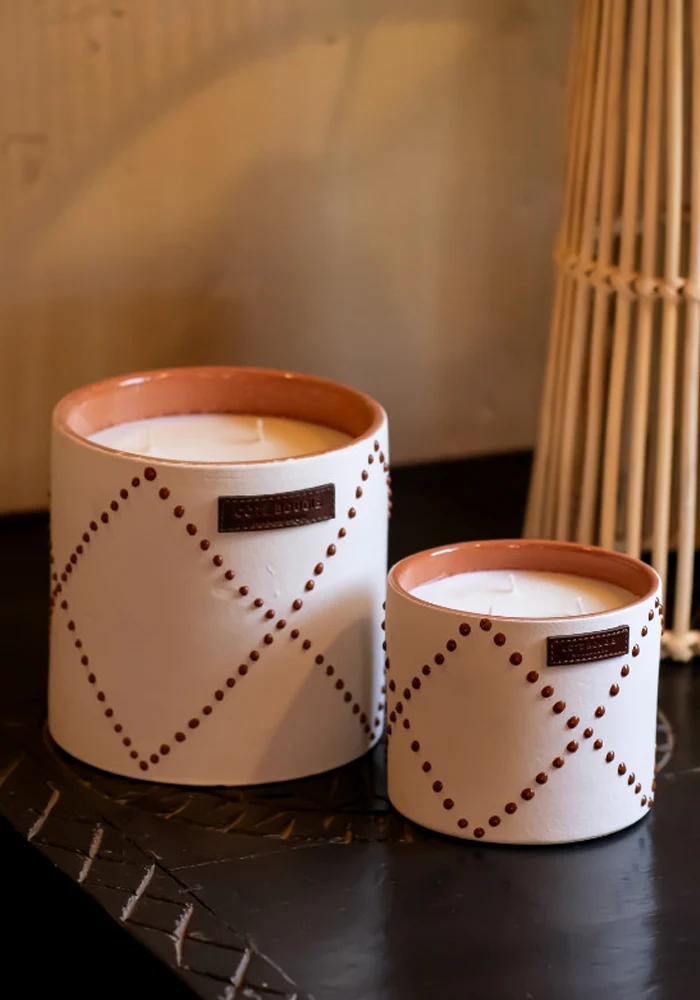 Bougie de la collection Nomad Blanc, décorée de pois terracotta.