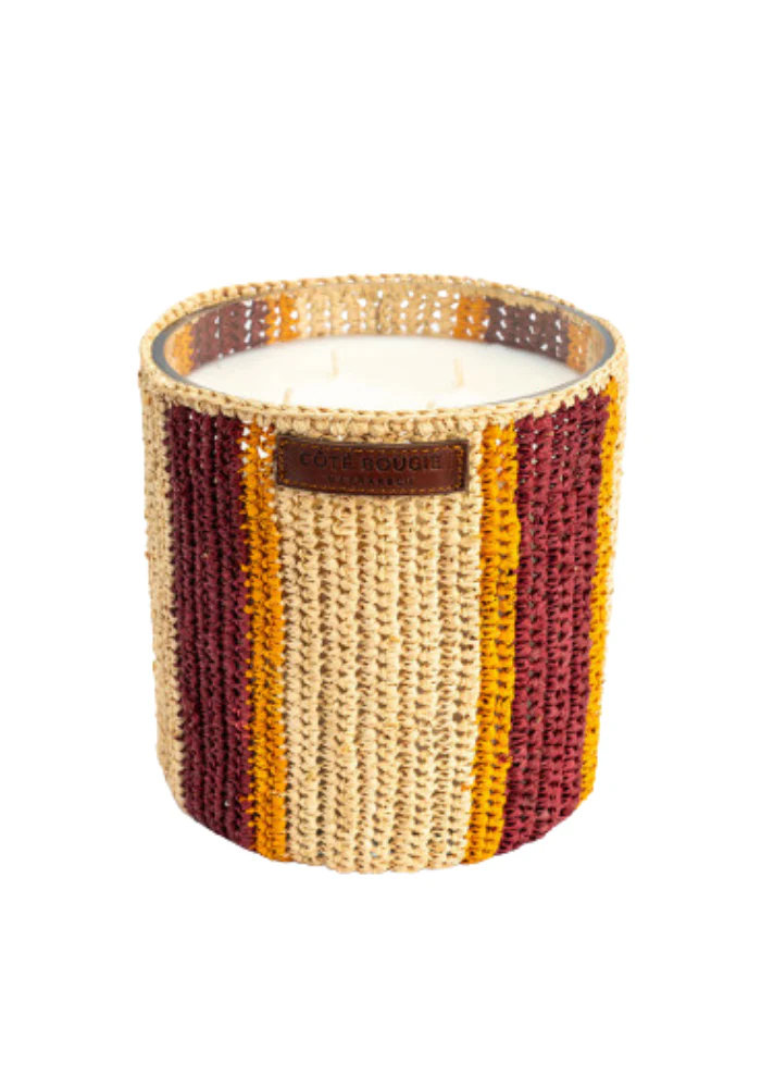Caractéristiques : Cire : 100 % végétale Parfum : Dattes (créé à Grasse) Pot : Raphia tressé à la main – création artisanale Fabrication : Artisanale au Maroc Pot réutilisable (objet déco, vide-poche, cache-pot) Dimensions : 12 cm Ø × 20 cm – 5 mèches Durée de combustion : 400 heures