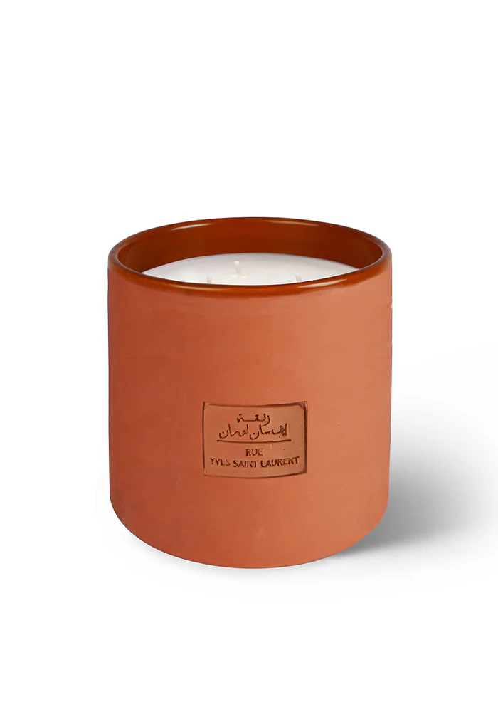 Bougie Rue Yves Saint Laurent, en terre cuite. Caractéristiques : Senteur : Rue Yves Saint Laurent Matière : Terre Cuite Dimensions : 15 cm de diamètre Durée : 180 heures Mèche 100% coton On adore : La team Blush est fan de cette odeur, qui laisse place un instant aux palmiers du jardin de Majorelle.