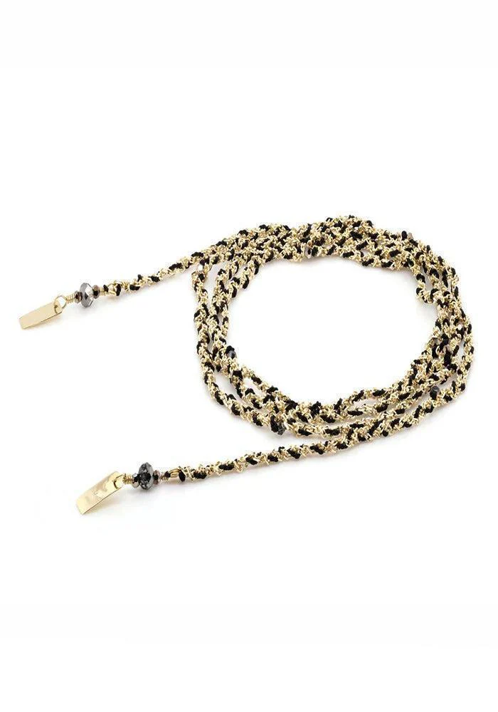 Bracelet tressé multi-tours, en vermeil et fil de soie noir incrusté de perles de cristal, qui peut également se porter en collier.