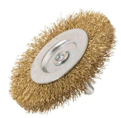 Brosse circulaire ø50 sur tige de 6 mm, à fils ondulés en acier laitonné. Pour nettoyage, dérouillage, polissage des pièces en métal ferreux ou non ferreux, bois, plastiques. A monter sur meuleuse pneumatique ou perceuse. Norme : EN1083