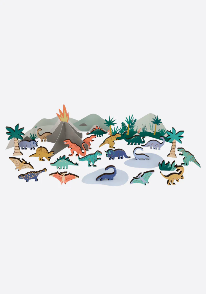 - 20 dinosaures et 3 éléments de végétation en bois