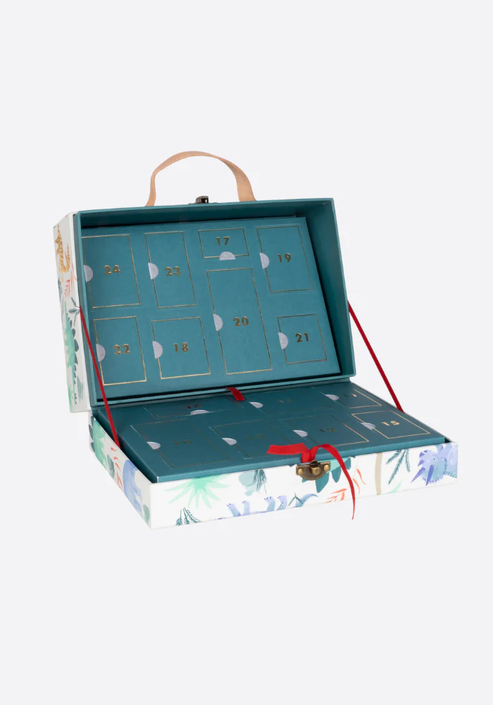 Caractéristiques : 20 dinosaures et 3 éléments de végétation en bois Décor en carton à déplier et assembler Présenté dans une valisette illustrée avec poignées en cuir et fermeture en laiton Rubans en satin rouge pour les tiroirs et les charnières Réutilisable comme jouet ou rangement après Noël Dimensions : 22,9 × 15,2 × 10,2 […]