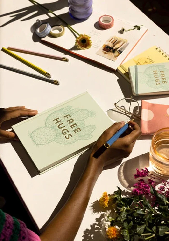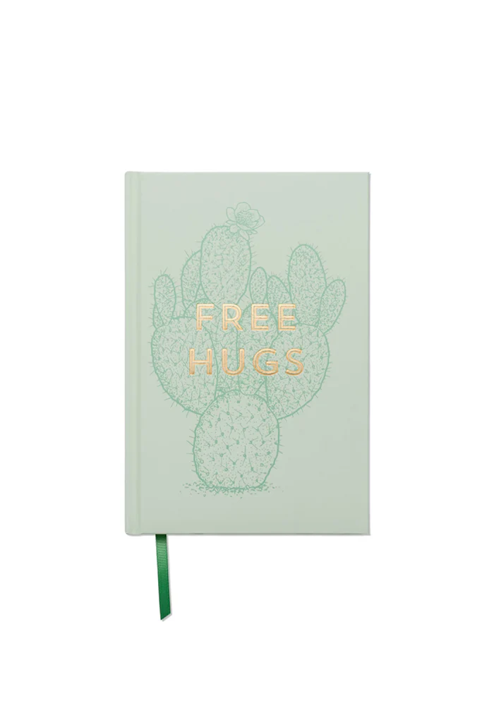 Carnet Free Hugs avec une couverture rigide verte avec un texte « free hugs » en doré.