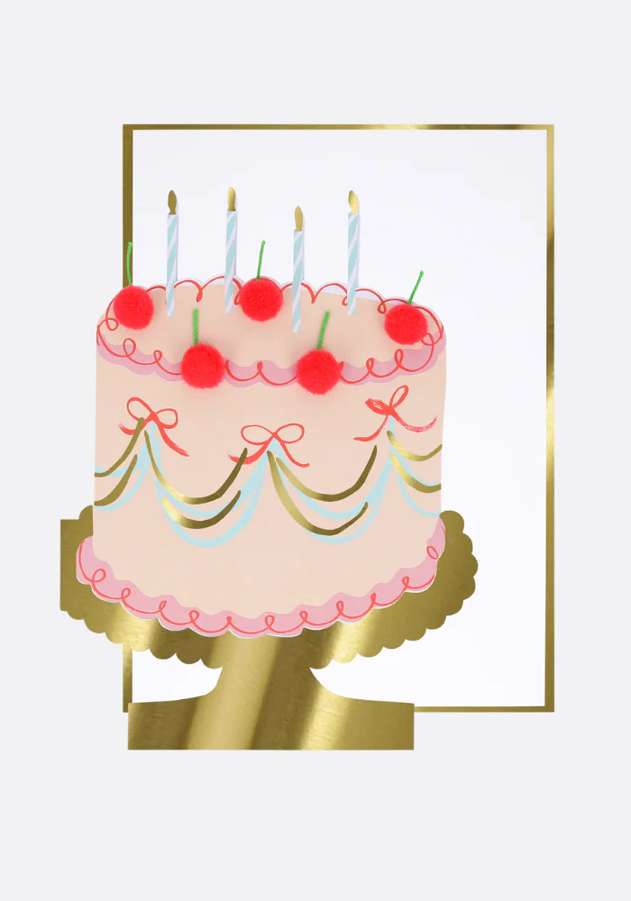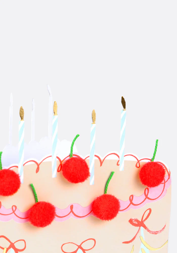 Carte dépliante en forme de gâteau 3D multicolore avec des pompons rouge en reliefs. Caractéristiques : Cerises en pompons rouges avec des tiges en cordon vert Détails en feuille d’or brillante sur la base de la carte et l’enveloppe Message intérieur : Joyeux Anniversaire Dimensions du produit : 127 x 178 x 6 mm