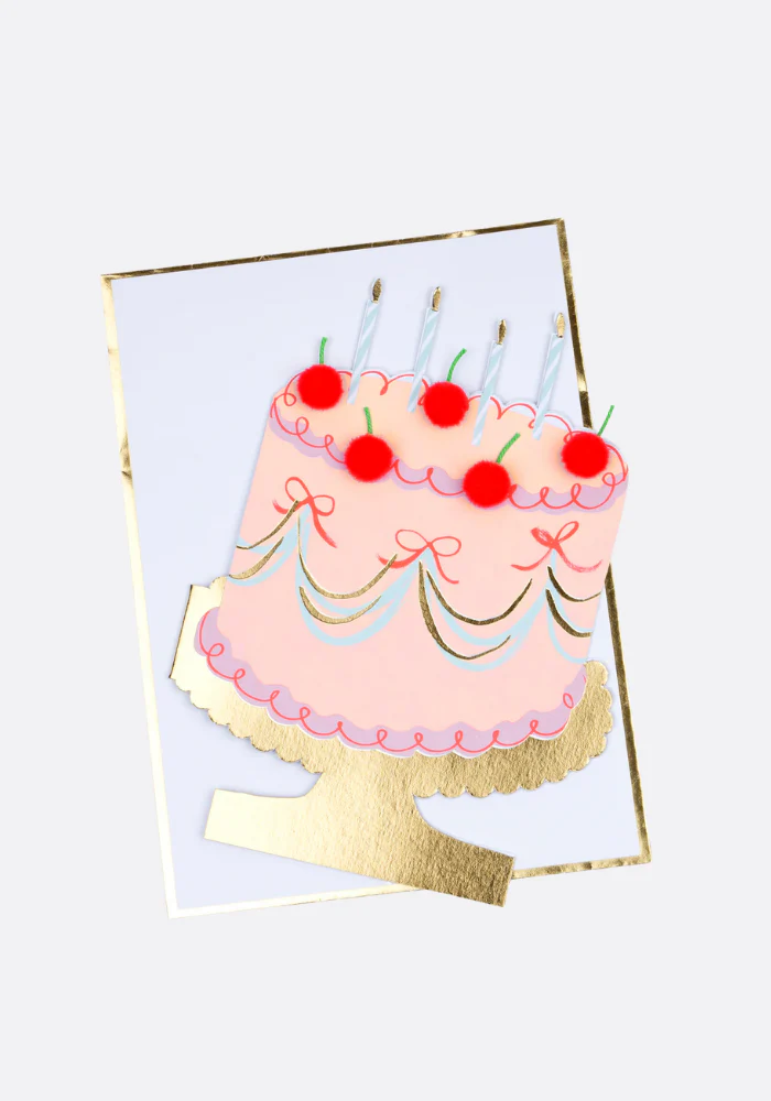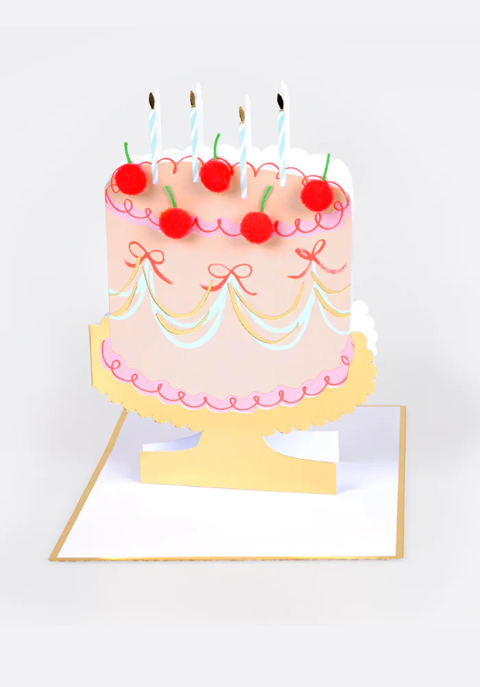 Carte dépliante en forme de gâteau 3D multicolore avec des pompons rouge en reliefs.