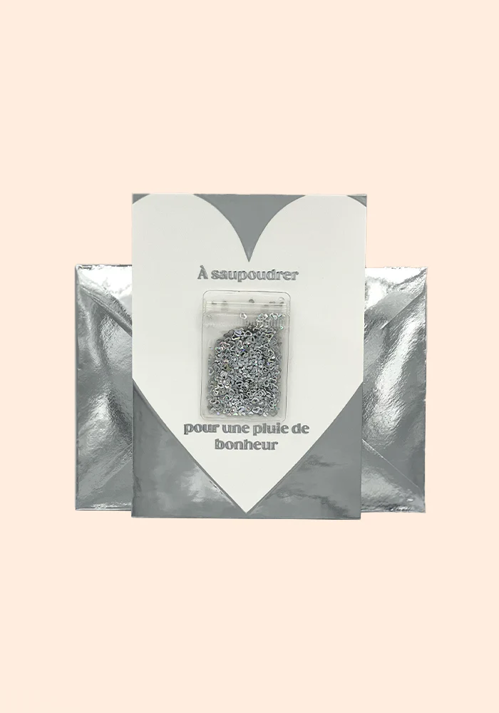 Carte de voeux À saupoudrer pour une pluie de bonheur sur fond blanc avec des finitions argentées et un petit sachet de coeurs argentés.
