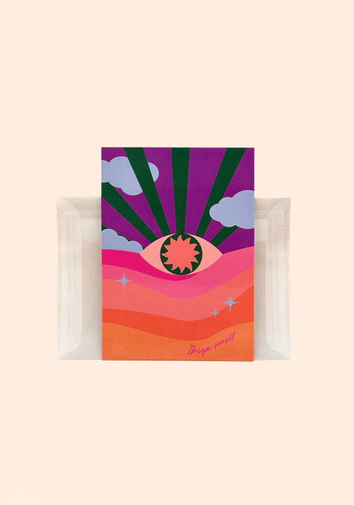 Carte de voeux Ibiza Sunset format A6 avec une illustration couché de soleil avec un oeil.