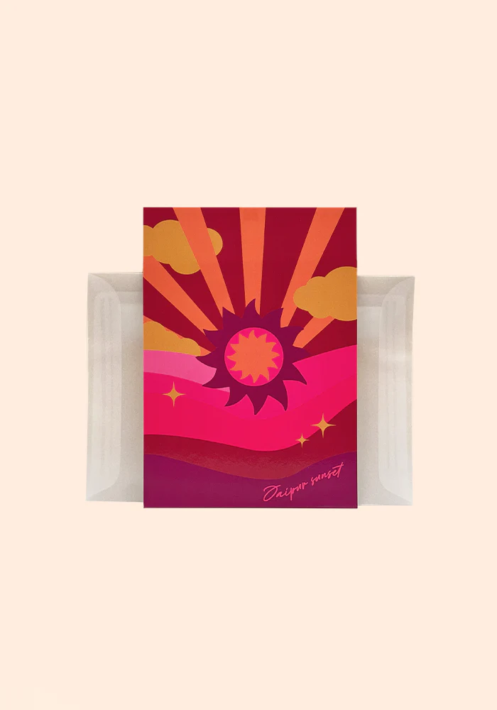 Carte de voeux Jaipur Sunset format A6 avec une illustration couché de soleil avec un soleil.