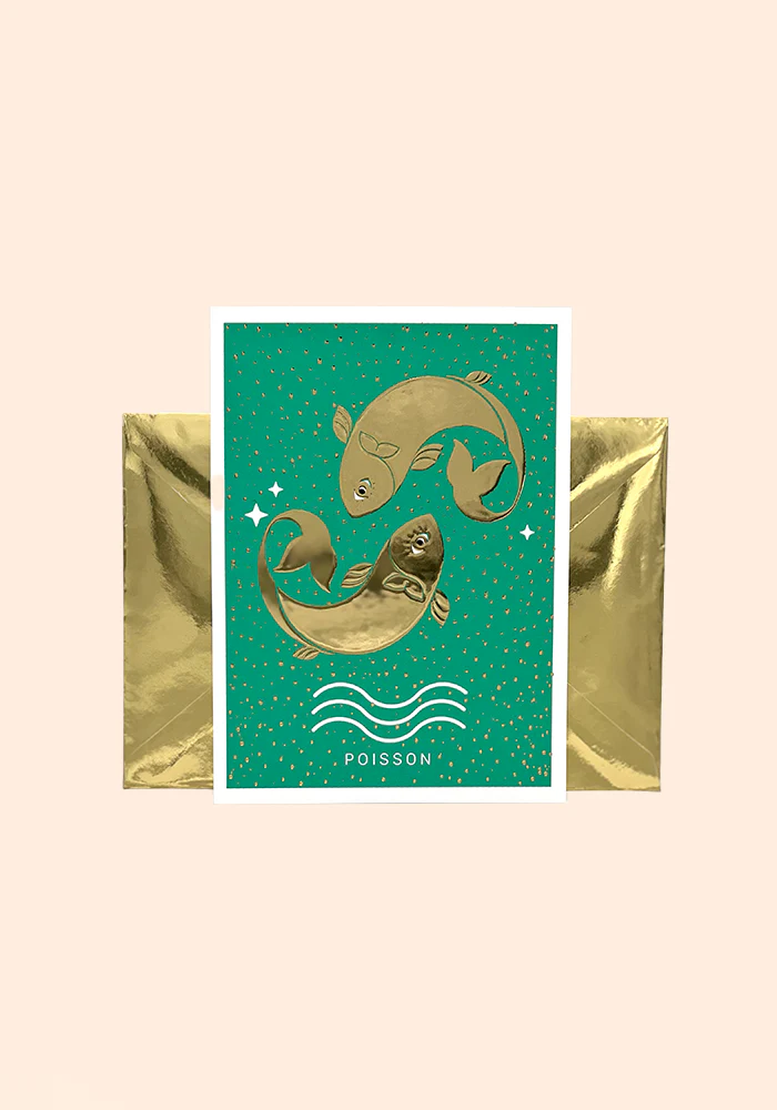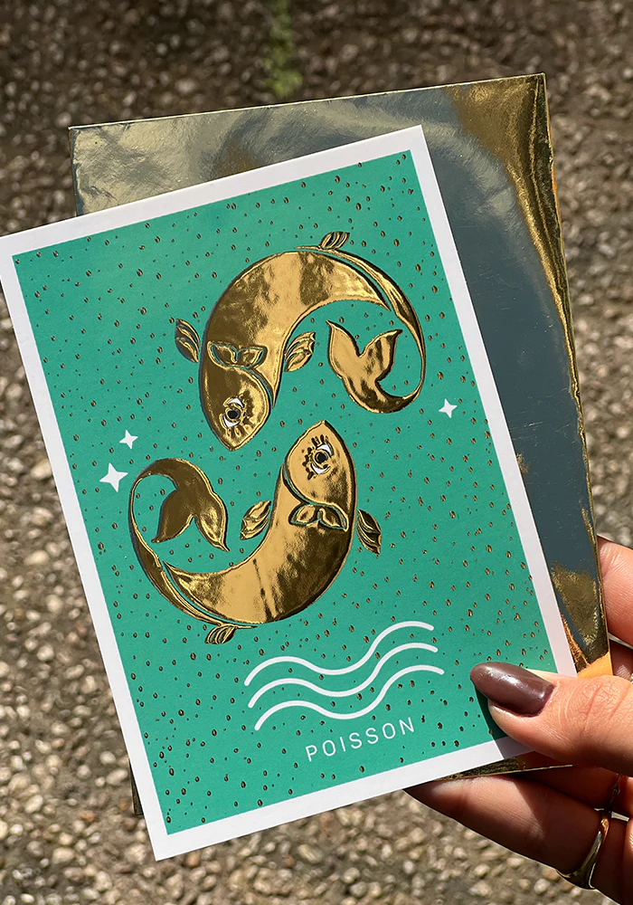 Carte signe astrologique qui représente le signe du poisson. Elle est colorée avec des détails dorés à chaud.