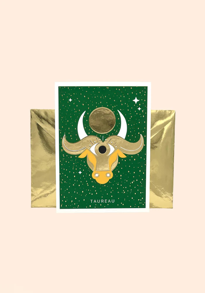 Carte signe astrologique qui représente le signe du taureau. Elle est colorée avec des détails dorés à chaud.