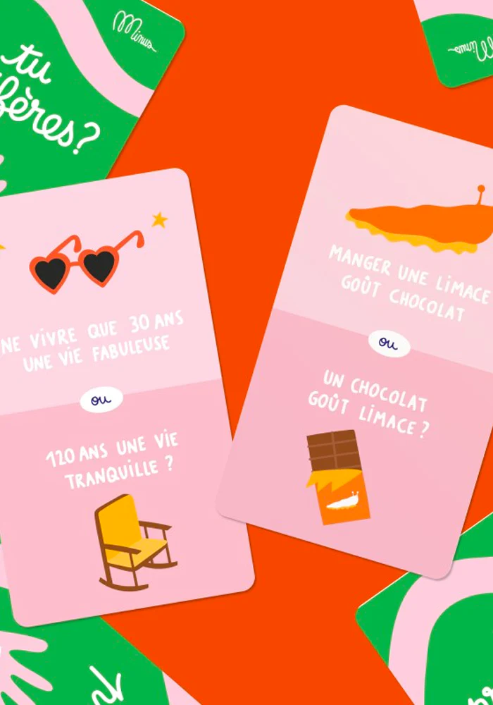 Certains choix en disent long sur vous ! Voici un jeu de 25 cartes qui vous entraînera dans des débats sans fin plus drôles les uns que les autres ! 5 min (minimum) de rire assuré où vous allez découvrir votre enfant, votre frère, votre amie… sous un autre jour !