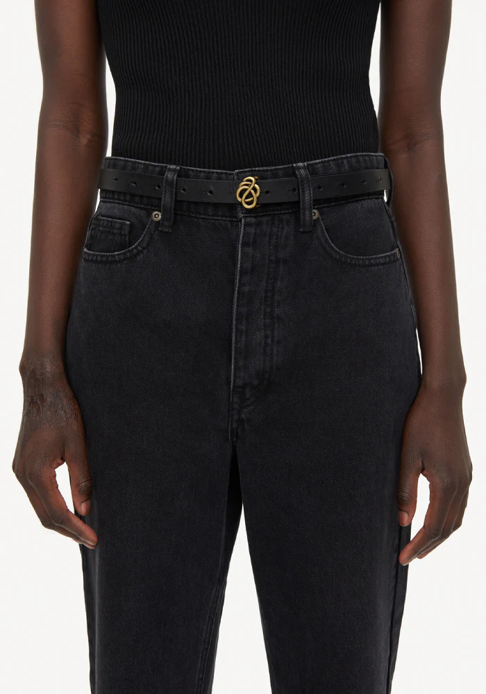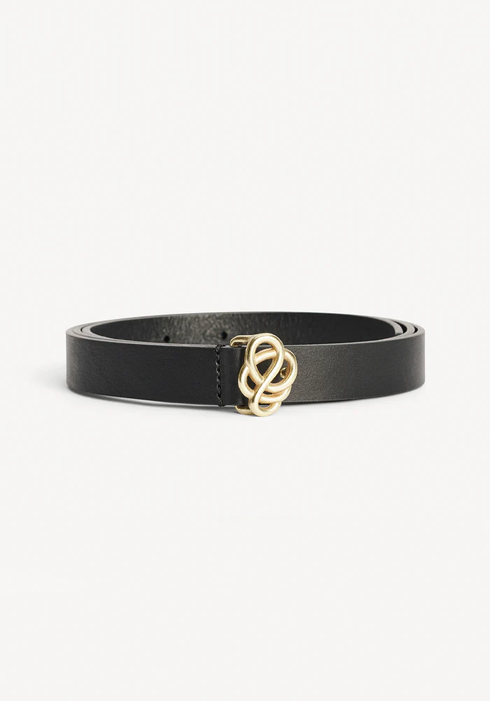 Ceinture Ouma en cuir de vachette noir avec une boucle en forme d’arabesques doré.