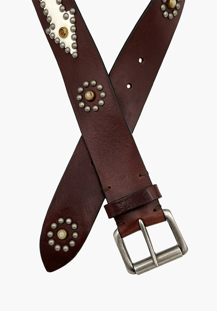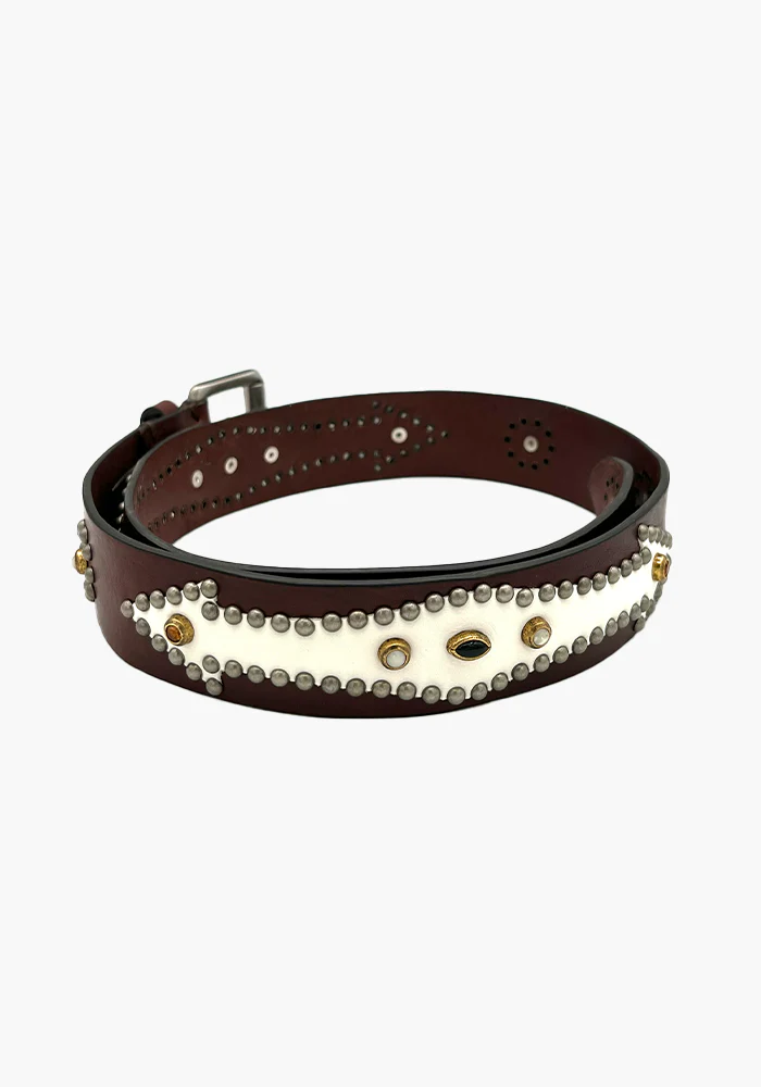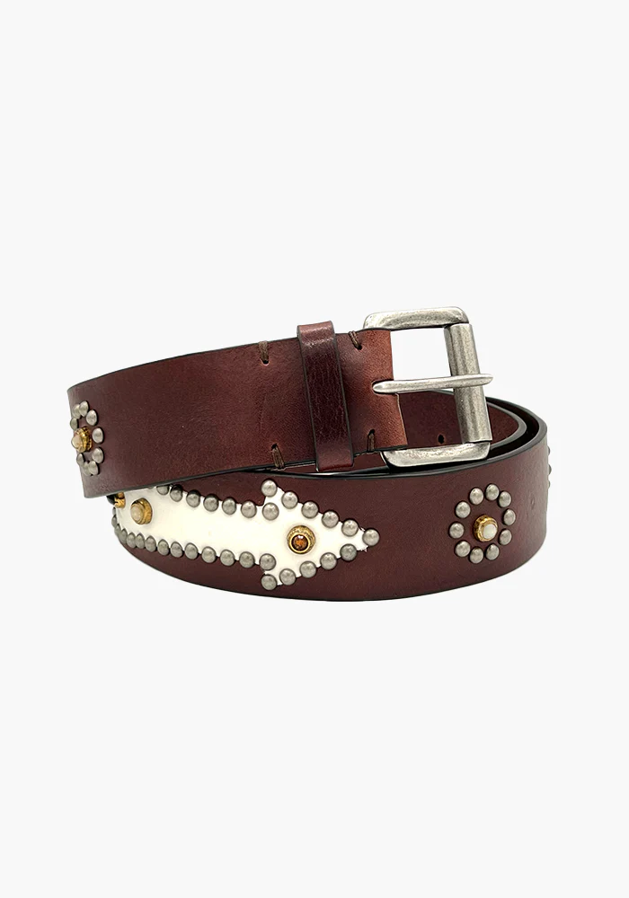 Ceinture en cuir marron avec des doubles flèches crème bordées de clous et pierres serties.
