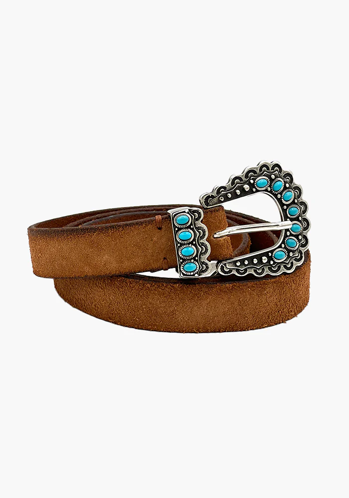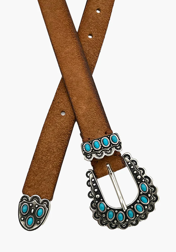 Ceinture en croute de cuir Tc Crus avec une boucle en métal argenté décorée de turquoises. .
