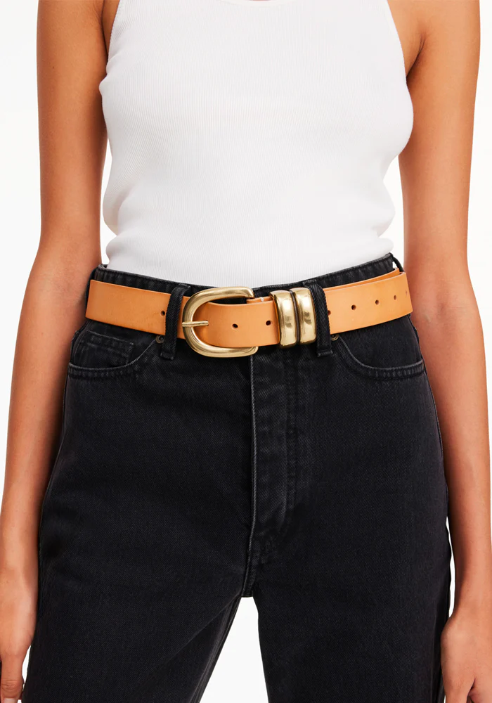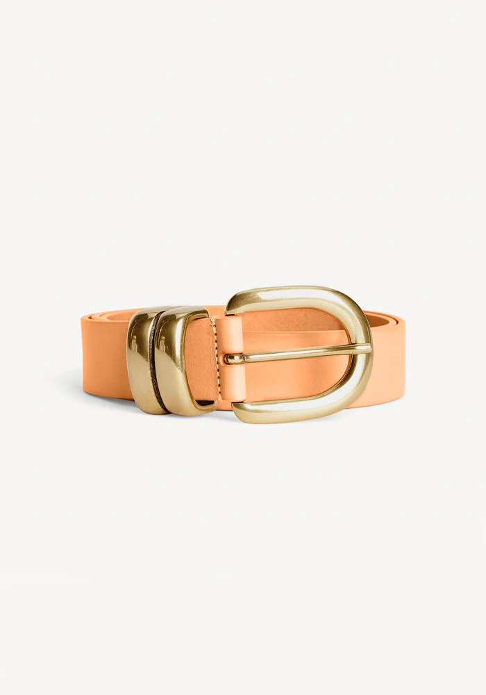 Ceinture Zoira en cuir de vache avec une boucle composée d’un demi ovale et de deux bandes dorés.