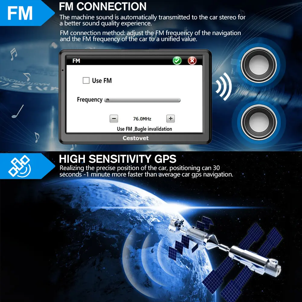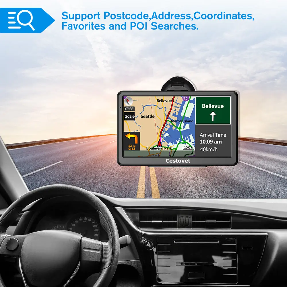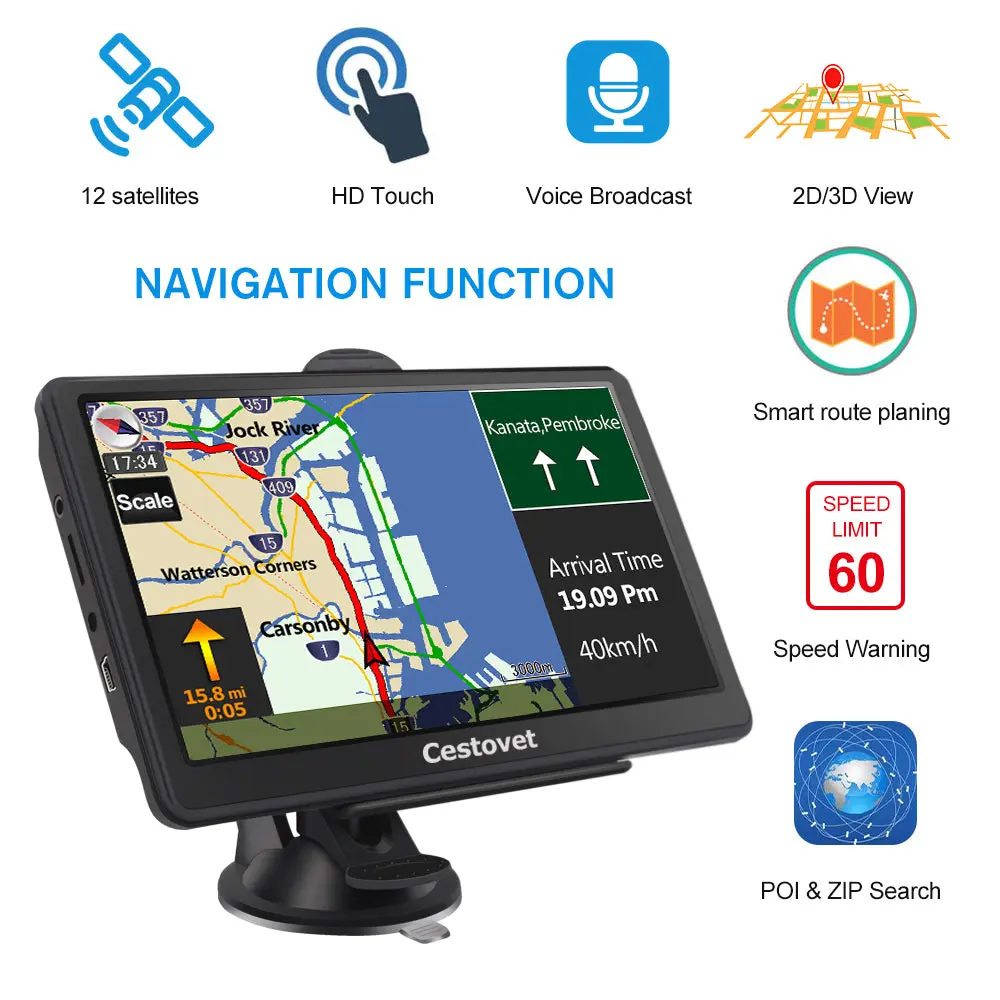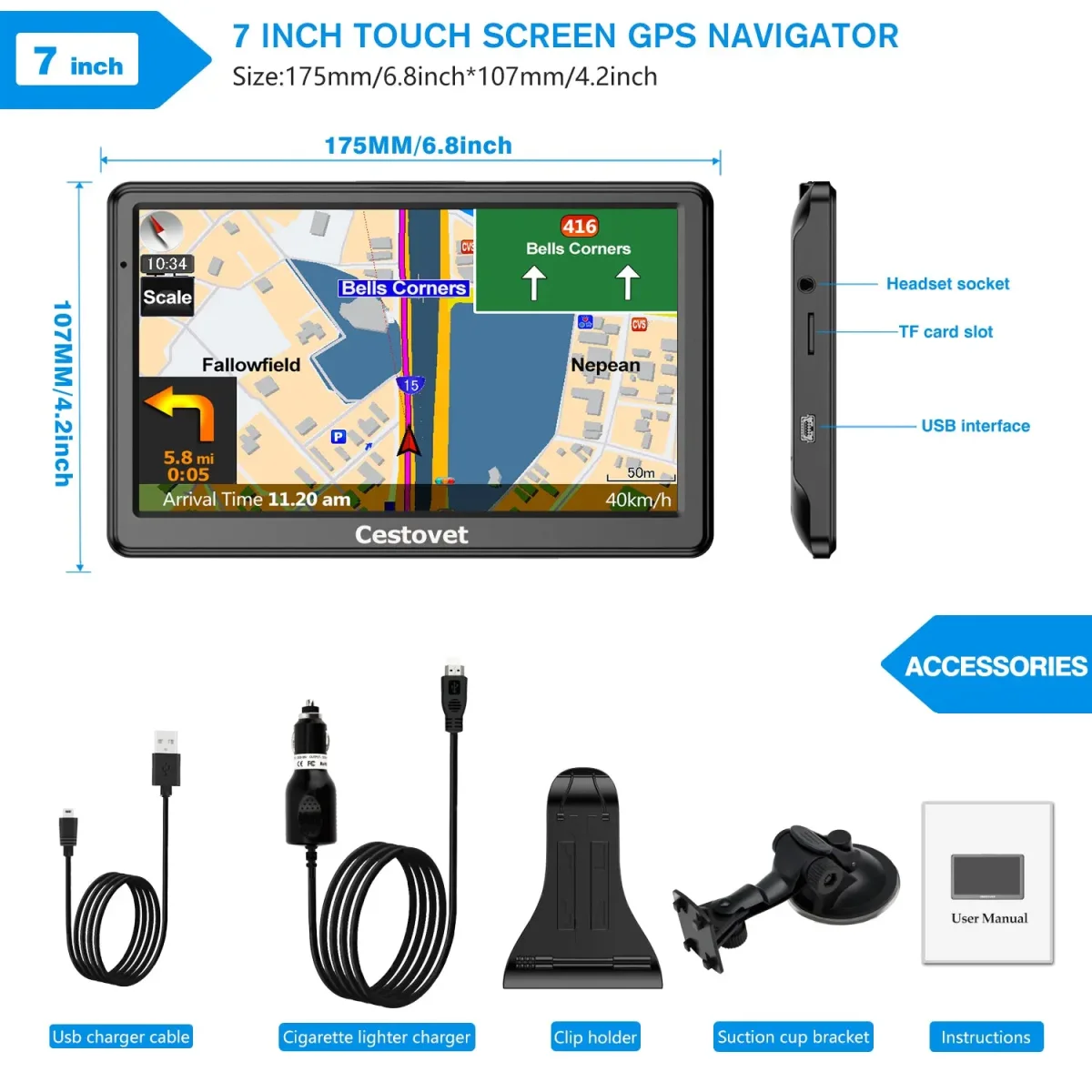 Cestovet GPS Navigation 7 Inch High-Definition Touch Screen with Bluetooth/ FM /Speed Alerts/ Lifetime North America Maps for DC 12V&24V Car Truck RV