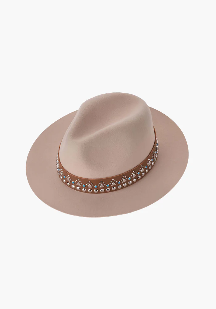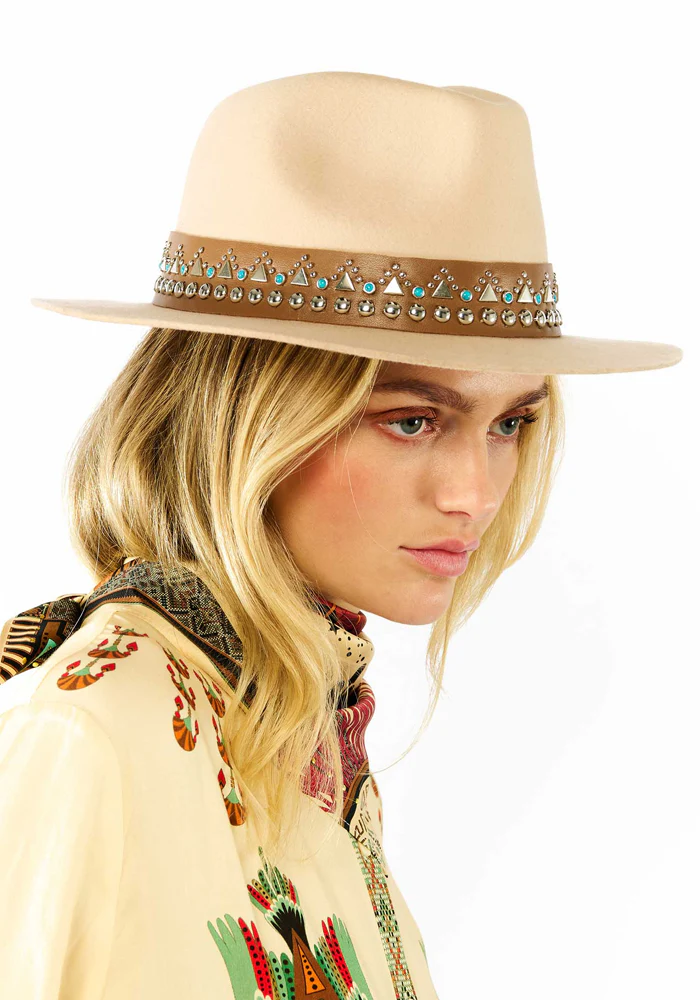 Chapeau Zamora en laine beige avec un lien décoré de clous et de perles turquoises.