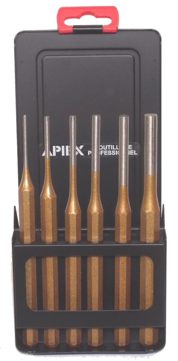 Jeu de 6 chasse-goupilles en acier chrome molybdène.Dans un boîtier serveur en métal. Dimensions : 2 – 3 – 4 – 5 – 6 – 8 mm x 150 mmPoids : 940 grammes