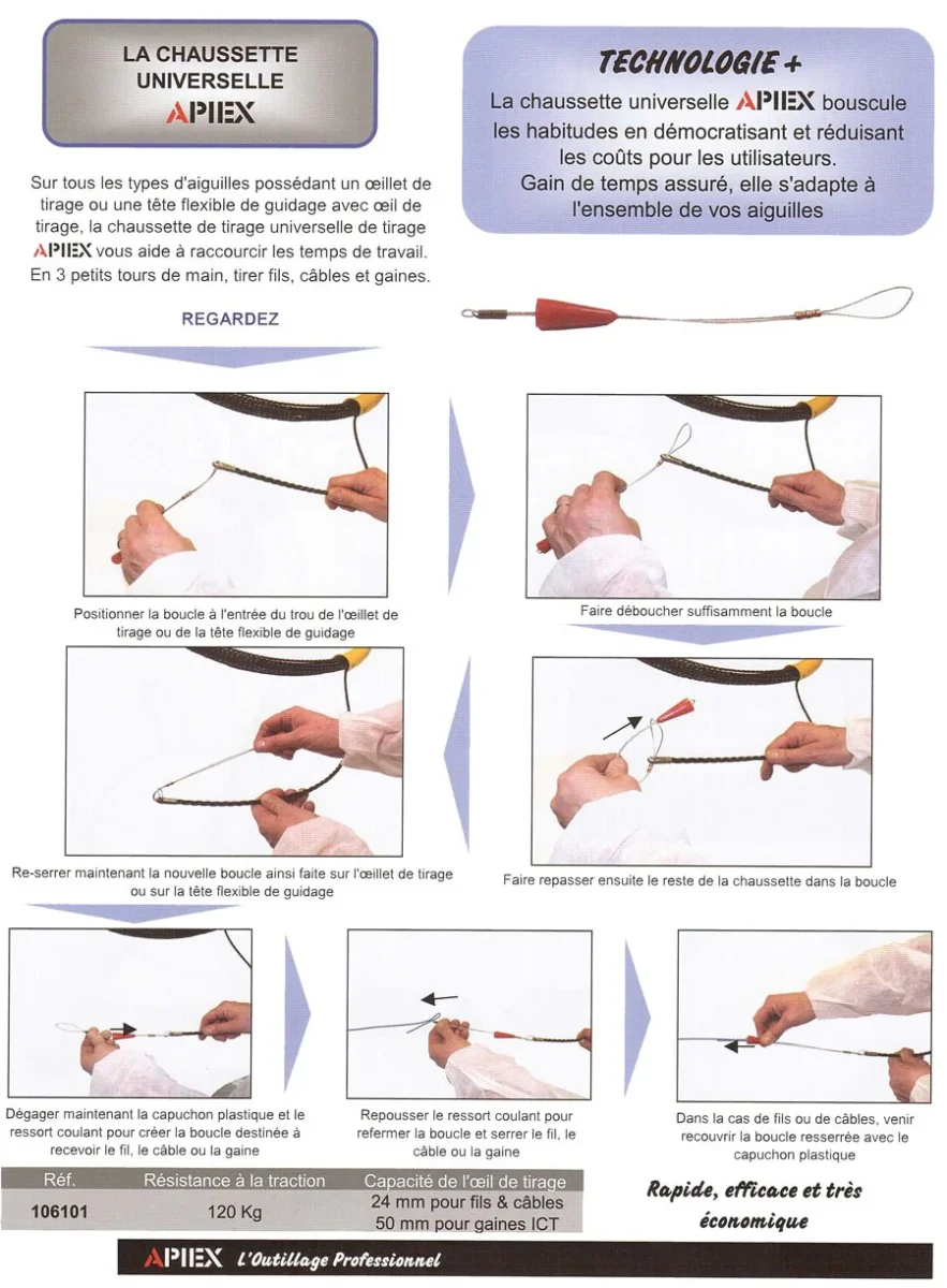 S’adapte sur tous les types d’aiguilles possédant un œillet de tirage ou une tête flexible de guidage avec œil de tirage, la chaussette de tirage universelle de tirage APIEX vous aide à raccourcir les temps de travail.