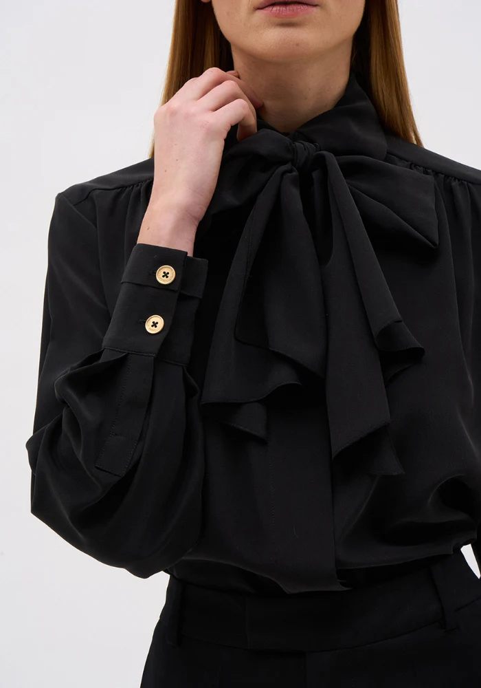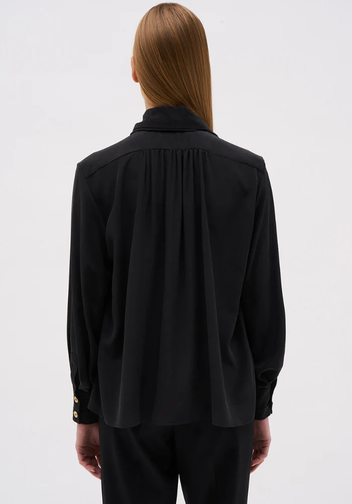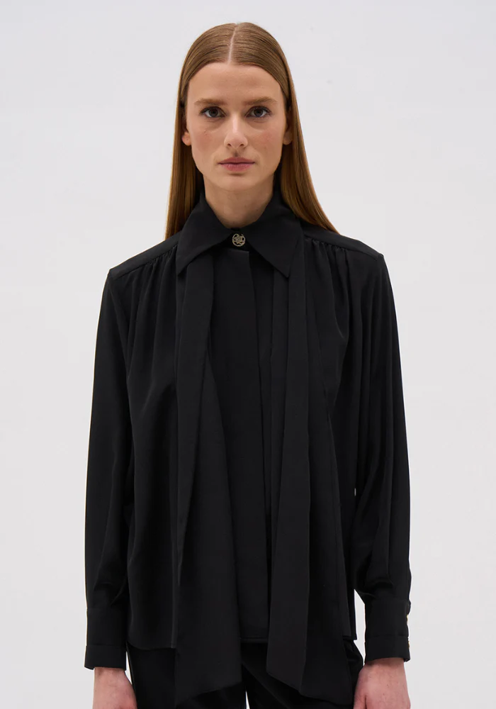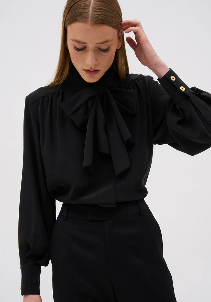 En 100% soie, la chemise Charlie associe manches longues à poignets boutonnés, col chemise structuré et nœud lavallière amovible pour une allure fluide, raffinée et intemporelle.