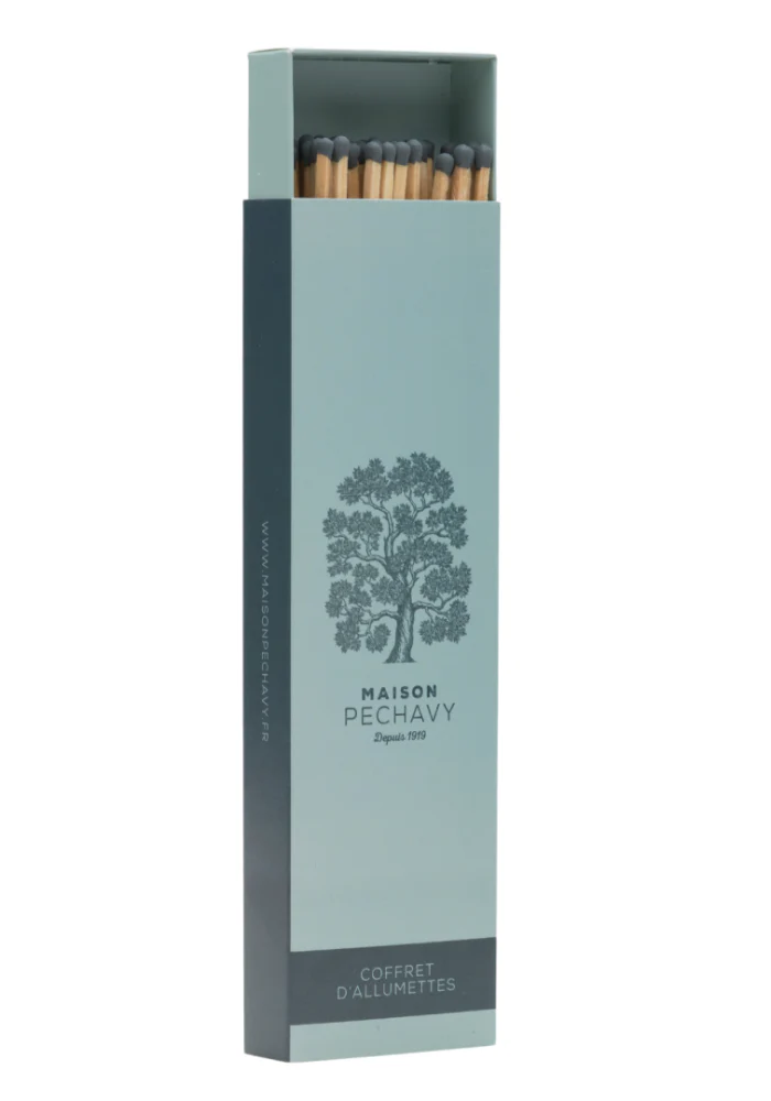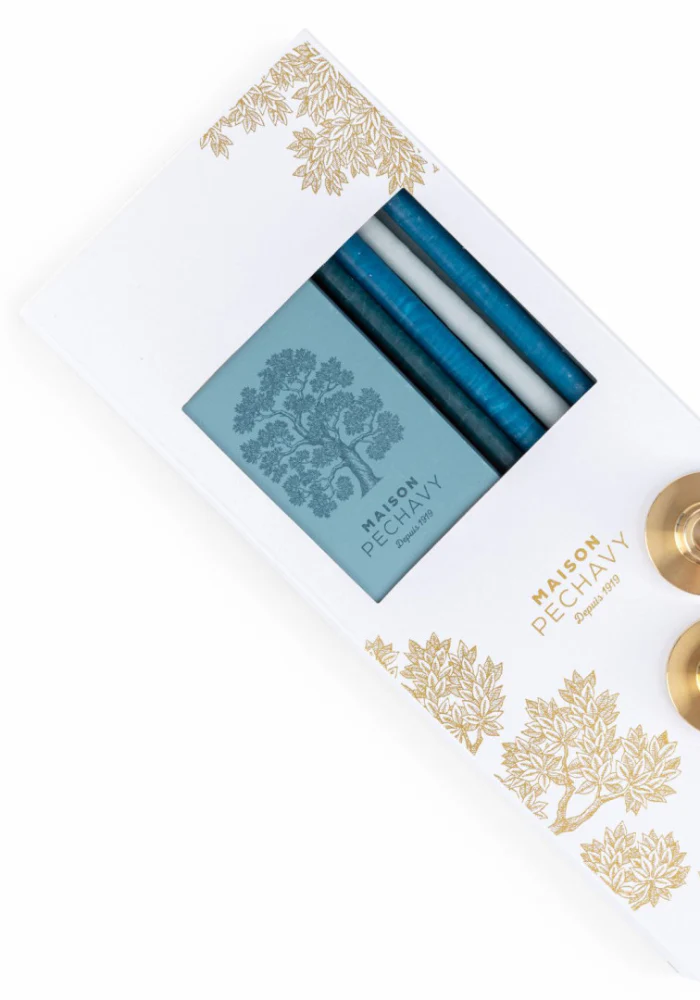 10 cierges artisanaux dont 3 bleu paon, 4 pétrole et 3 céladon, accompagnés de 40 allumettes longues assorties, et 2 adaptateurs en laiton.