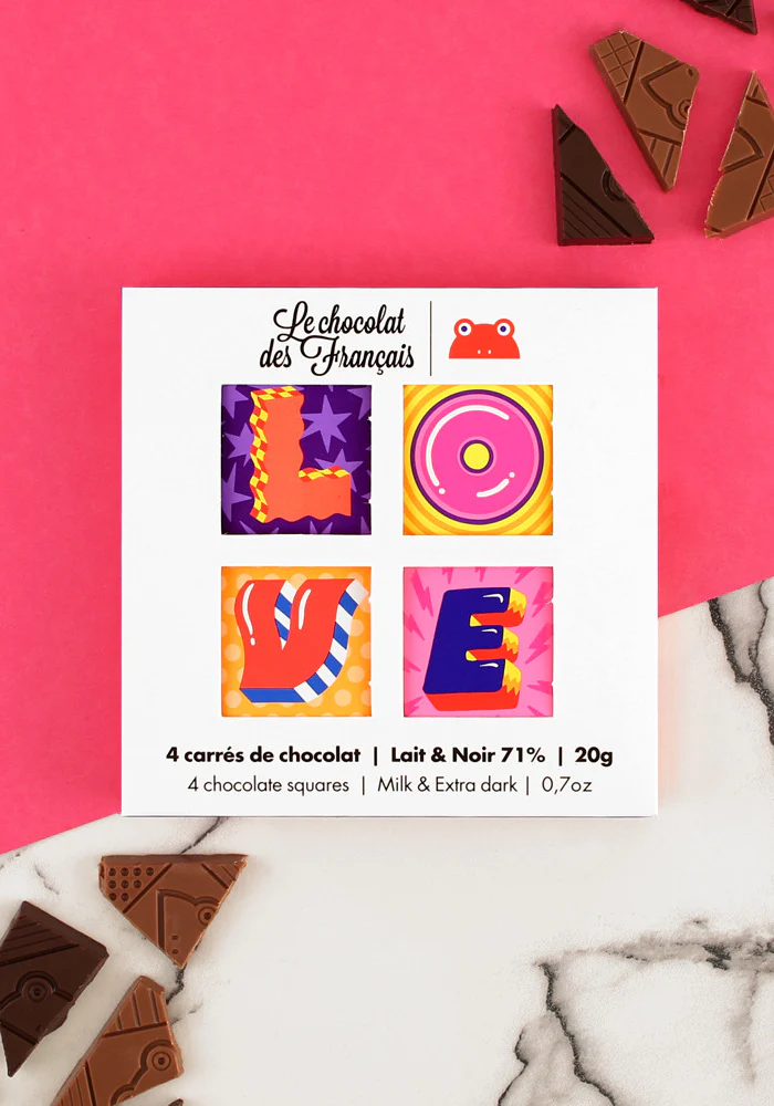 Caractéristiques : Contenu : 4 carrés de chocolat (lait & noir 71 %) Fabrication : Artisanale, près de Paris Ingrédients : Naturels, cacao d’Équateur et du Pérou, pur beurre de cacao Illustration : Axelle Doppelt Poids net : 20 g