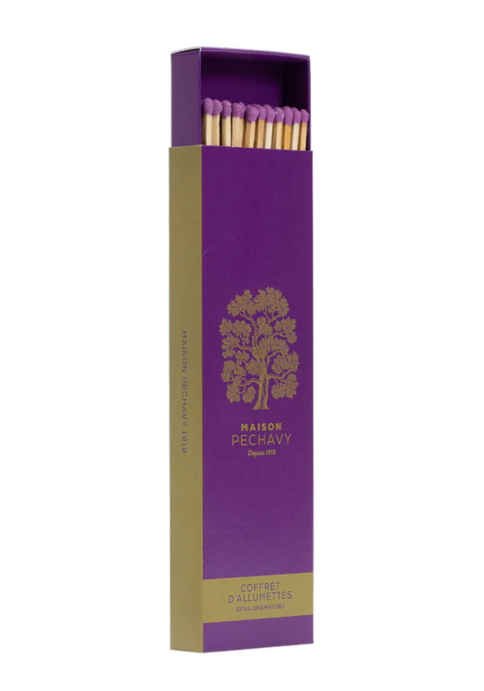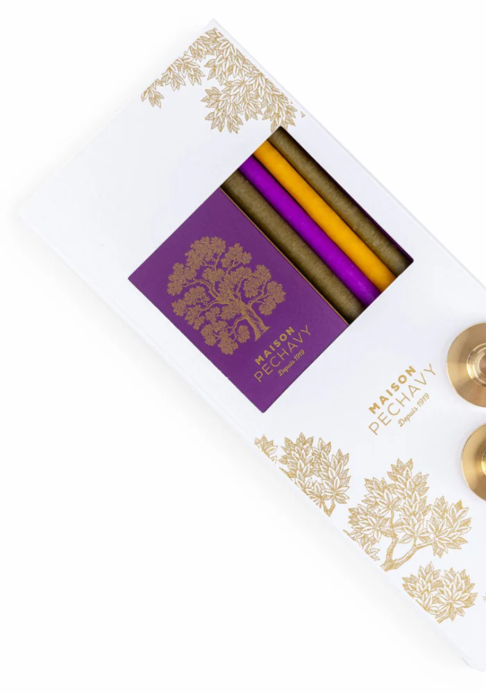 Coffret de 10 cierges artisanaux dont 4 kaki, 3 miel et 3 violet, accompagnés de 40 allumettes longues assorties, et 2 adaptateurs en laiton.