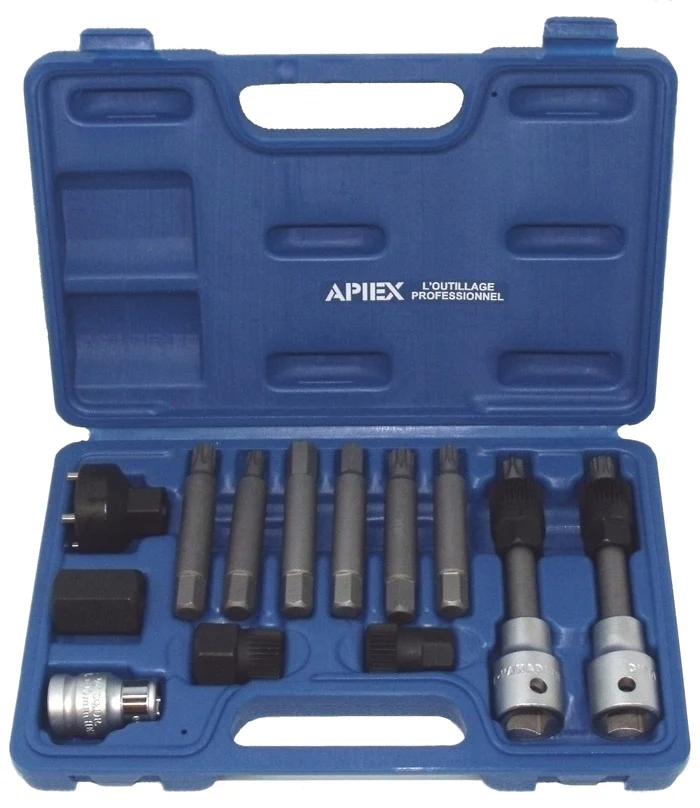 Composition de 13 pièces d’embouts et accessoires pour le démontage des poulies d’alternateurs débrayables.