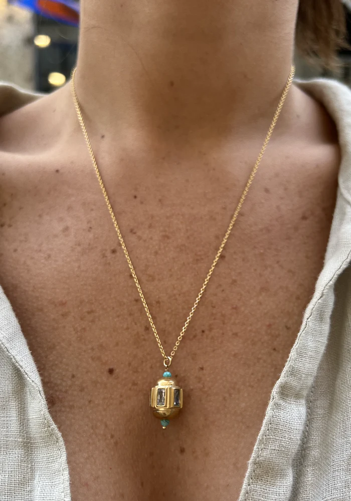 Collier Taly avec un pendentif ovale en plaqué or avec des strass rectangulaire blancs ainsi que deux billes sur chaque coté du pendentif.