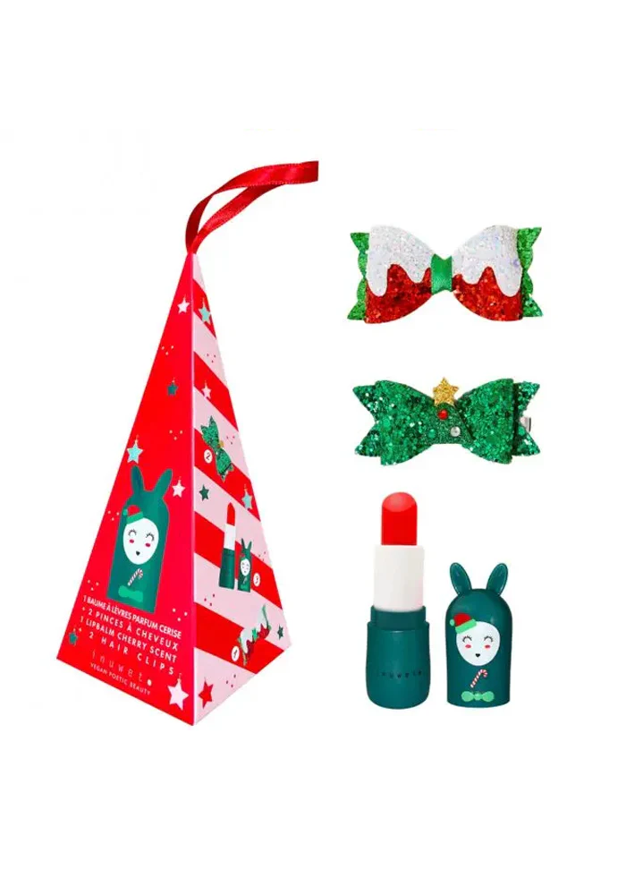 Cône de noël avec un baume à lèvres et deux barrettes de noël.