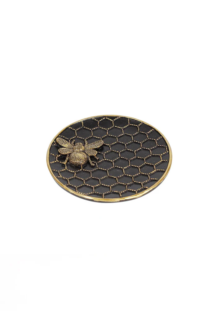 Coupelle noire et dorée en bois avec une abeille en relief avec des motifs nid d’abeille en 3D. Caractéristiques : Dimensions : 11,5 x 1,3cm