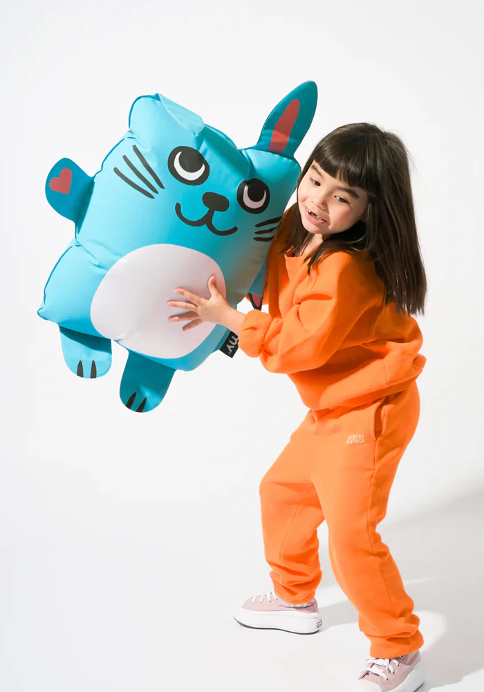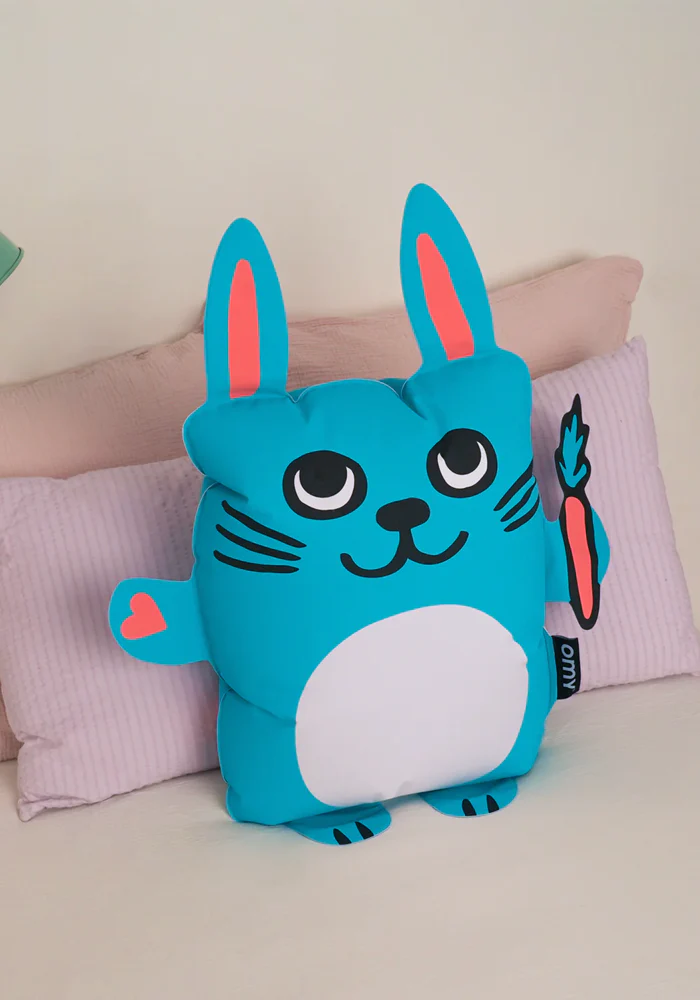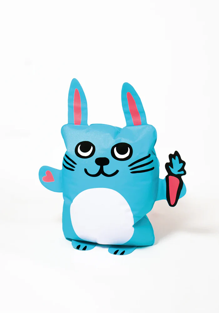 Coussin gonflable Bunny imprimé lapin bleu. Caractéristiques : Dimensions : 74,9 x 24 x 91,8 cm Composition : PVC sans phtalates et non toxique, enduit de coton durable. Non déhoussable. Se gonfle et se dégonfle facilement manuellement ou à l’aide d’une pompe à air. Ce coussin n’est pas une bouée.