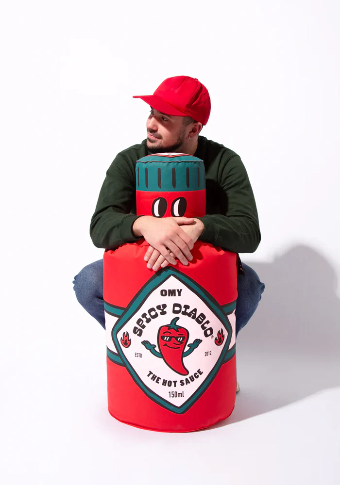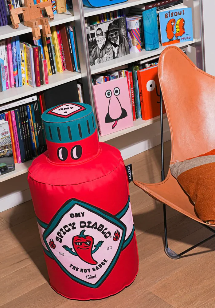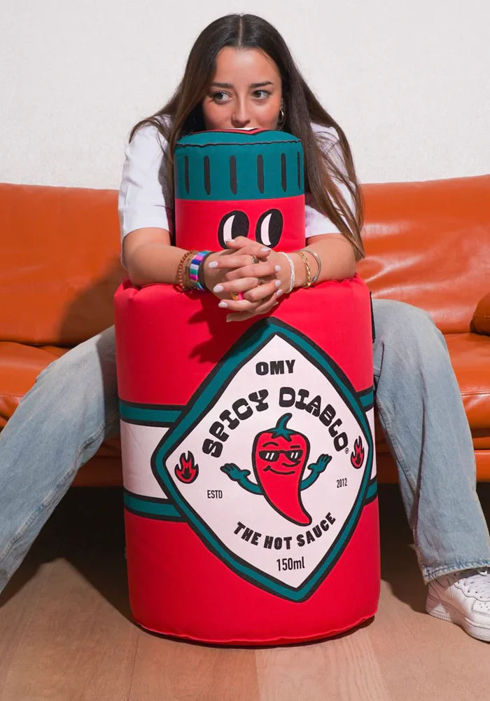 Coussin gonflable Spicy Diablo en forme de sauce pimentée.