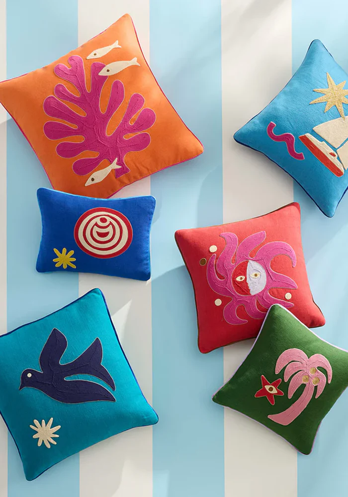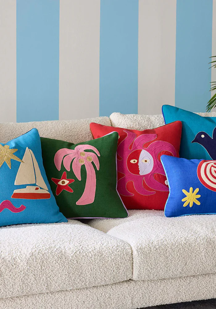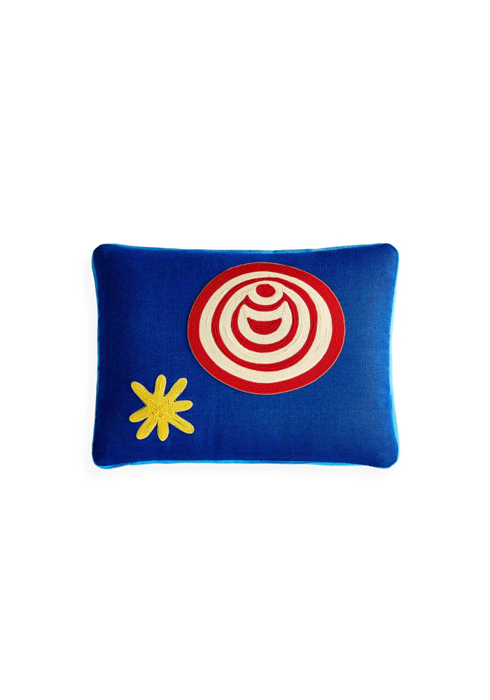 Coussin Playa Beach Hat rectangulaire en lin bleu avec un chapeau rouge et blanc et un soleil brodé. Caractéristiques : Composition : 100% Lin Broderie cordée Dimensions : 30,5 x 40,5 cm Insert en plumes/duvet inclus Fermeture éclair cachée Entretien et nettoyage : Nettoyer les taches avec un détergent doux Nettoyage professionnel recommandé