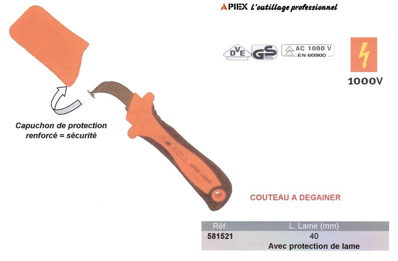 Couteau à dégainer les câbles isolé 1000 volts. Avec capuchon de protection de lame = Sécurité renforcée Longueur de lame : 40 mm
