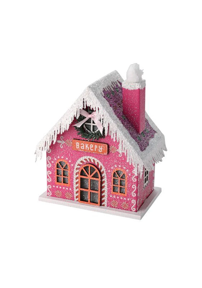 Décoration maison enneigée rose avec des led.