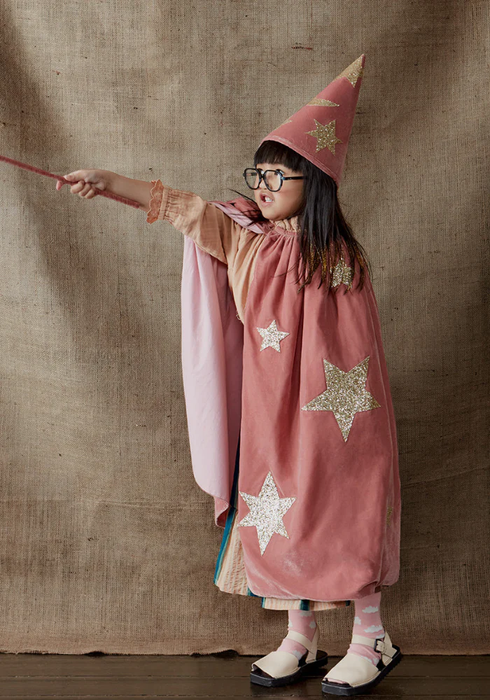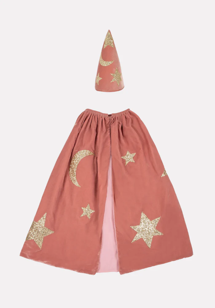 Caractéristiques : Contenu : Cape, chapeau et baguette magique Matière : Velours rose, détails en tissu pailleté doré Doublure : Coton Fermeture : Pression au col Dimensions : Tour de cou 45,7 cm – Longueur 72,4 cm Âge : 3 à 6 ans