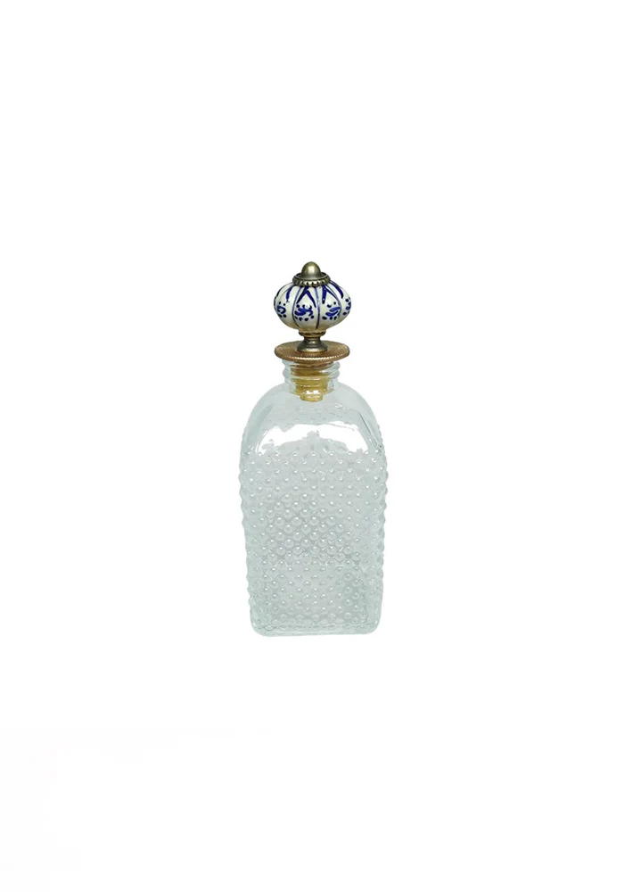 Fiole en verre avec des billes en relief et un couvercle blanc et bleu.