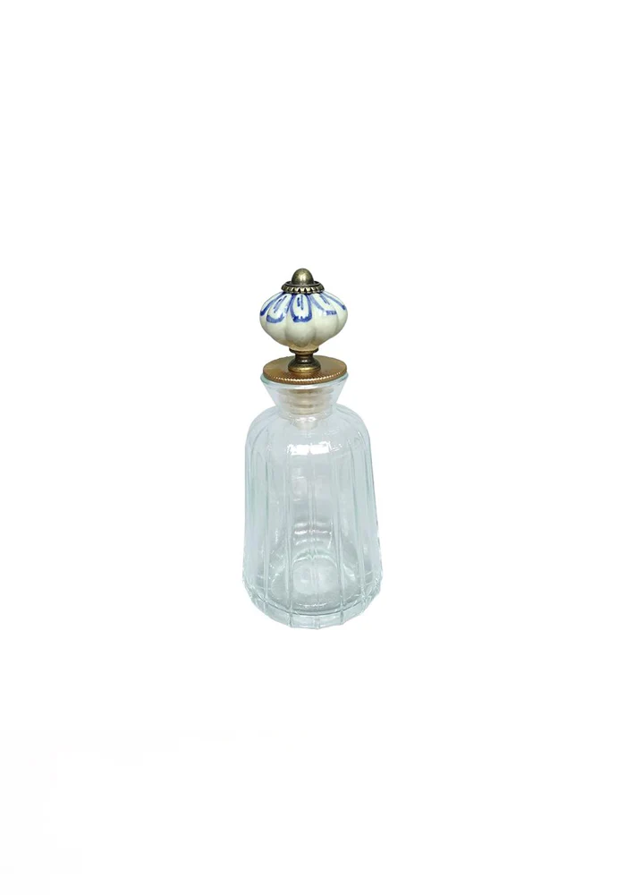 Fiole en verre striée avec des colonnes et un couvercle blanc et bleu