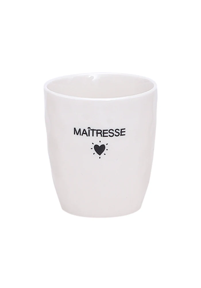 Gobelet blanc irrégulier avec le message « maîtresse ».