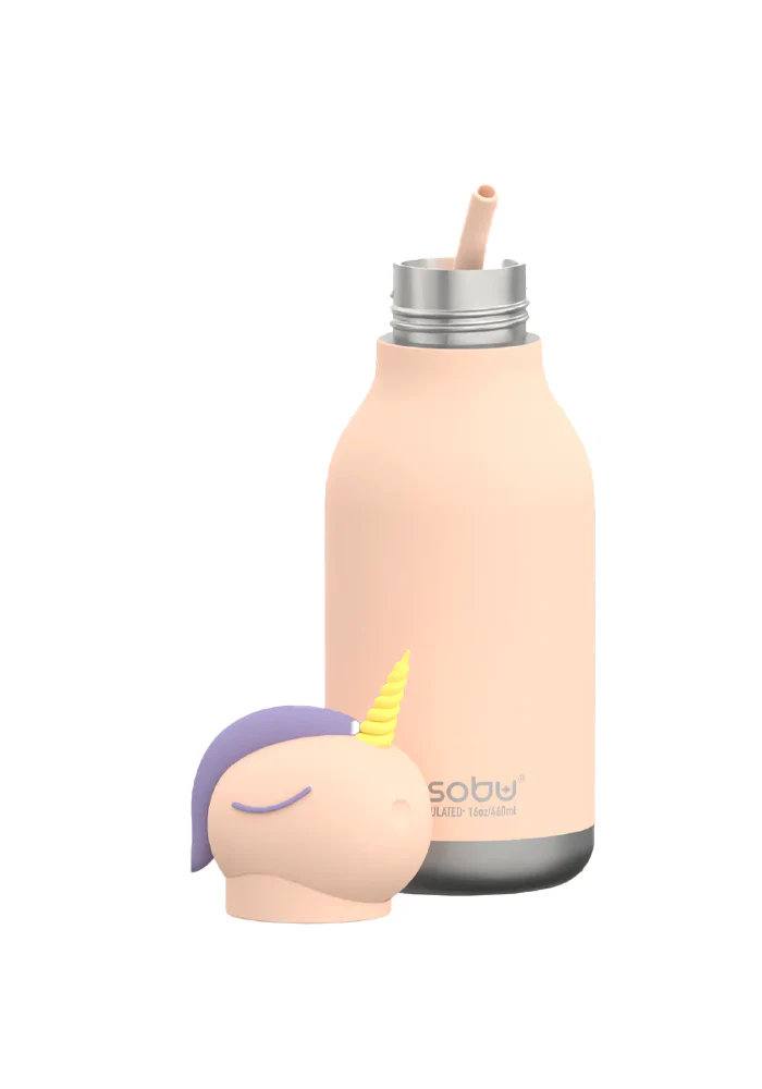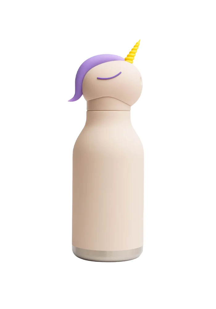 Gourde isotherme Licorne en acier inoxydable avec une tête de licorne amovible en silicone.