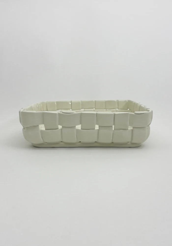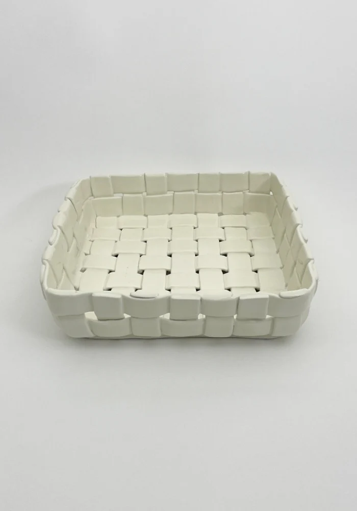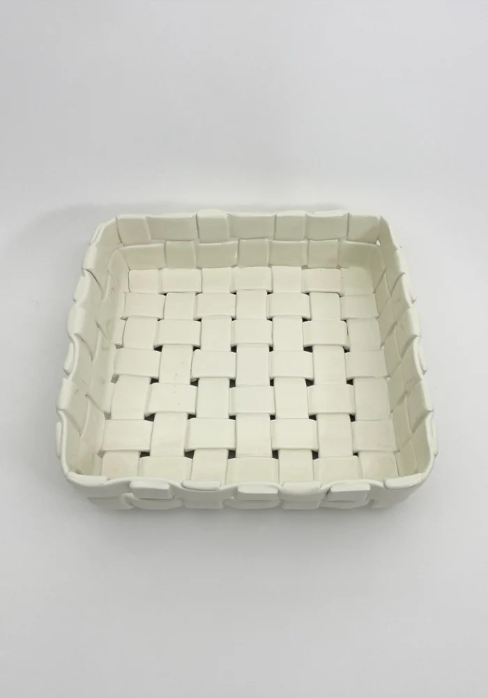 Grand plat carré en céramique blanc au design tressé.