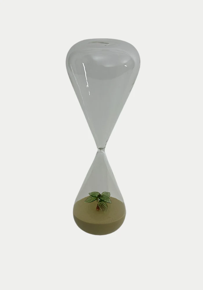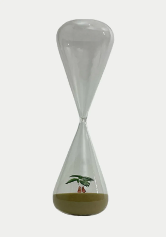 Grand sablier Sahara en verre transparent avec du sable couleur désert et un petit décor de palmier à l’intérieur, évoquant une oasis miniature.