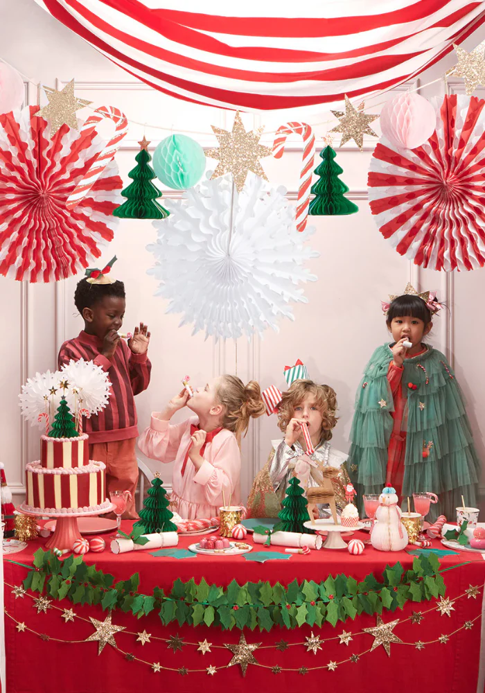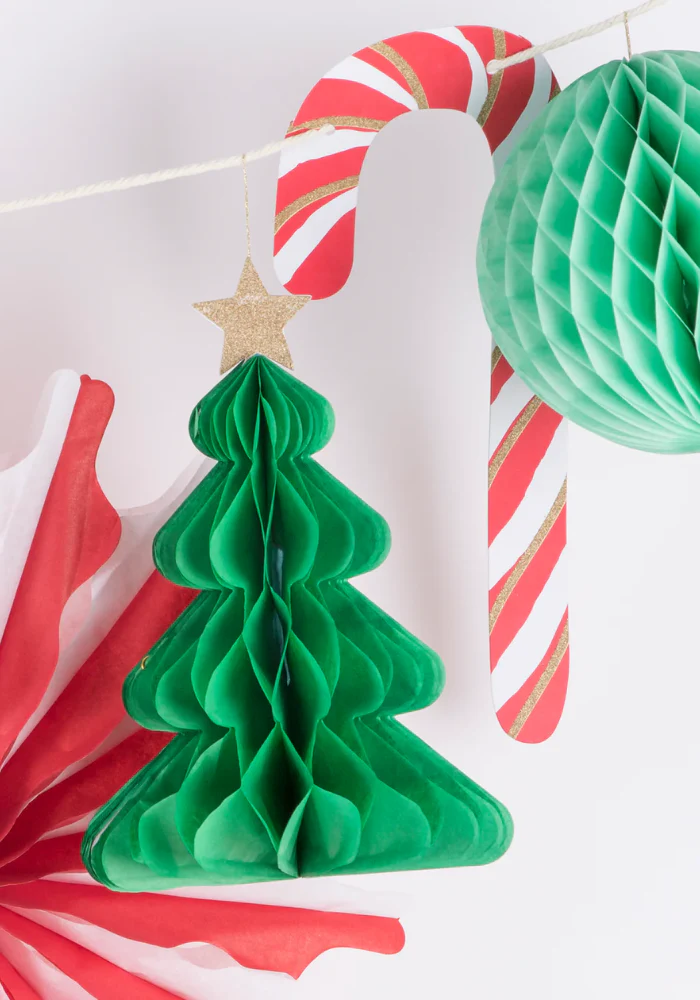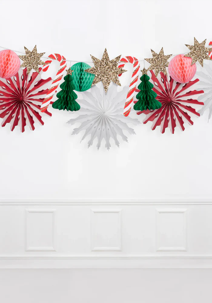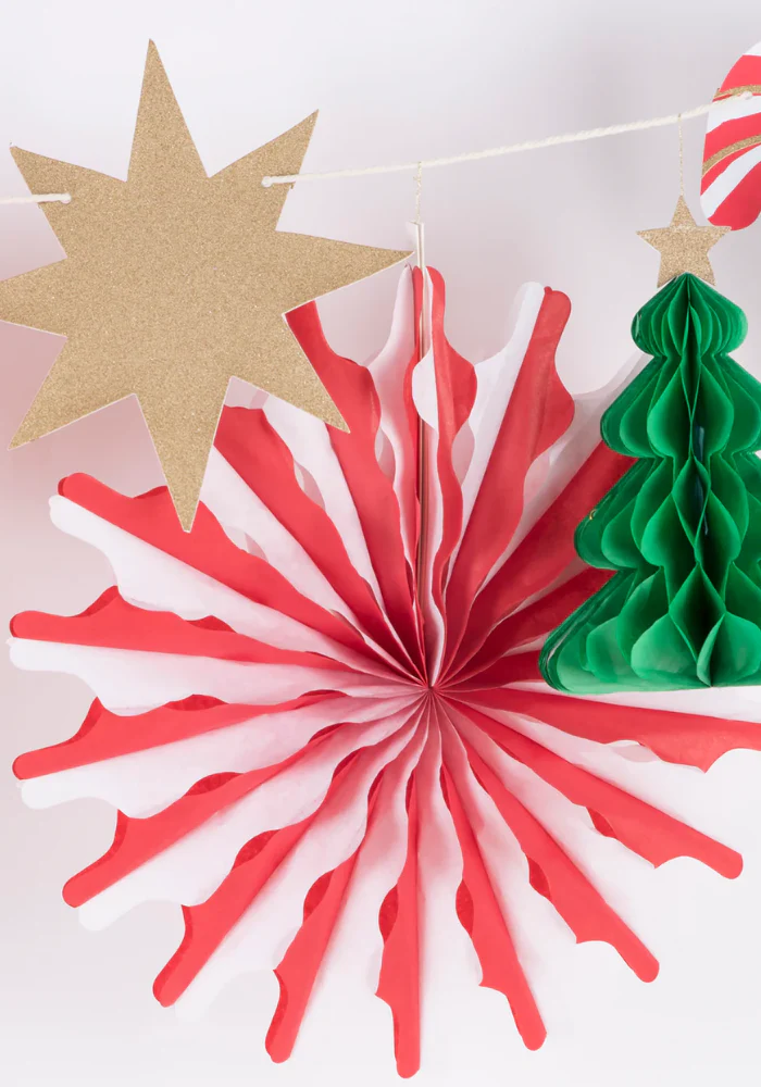 Guirlande de noël en papier de soie avec des étoiles dorées, des rosaces rouges et blanches, accompagnée de sapins et de cannes à sucre.