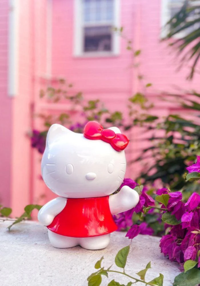 Figurine Hello Kitty en blanc et rouge laqué. Hello Kitty est debout et fait un signe de la main.