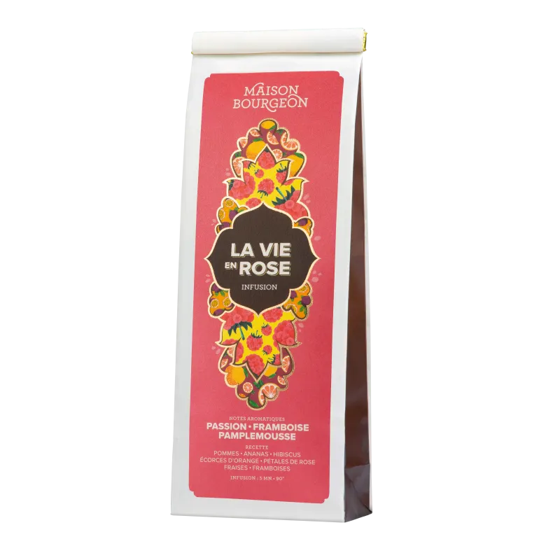 Avec La vie en rose, découvrez une infusion fruitée et savoureuse, au bon goût de fruit de la passion, framboise, et pamplemousse. De quoi voir la vie en rose, effectivement…